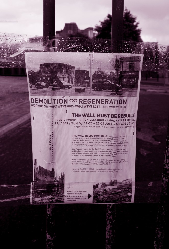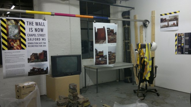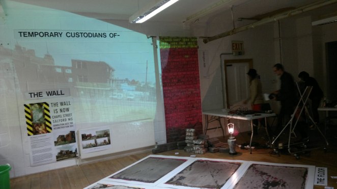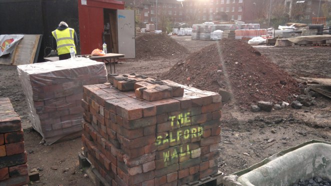 The Salford Wall was initiated by myself, an artist, in 2012. It is a heritage project about buildings and communities, achieved through rebuilding a section of the Old Bank Theatre which formerly stood at 301 Chapel Street, Salford.