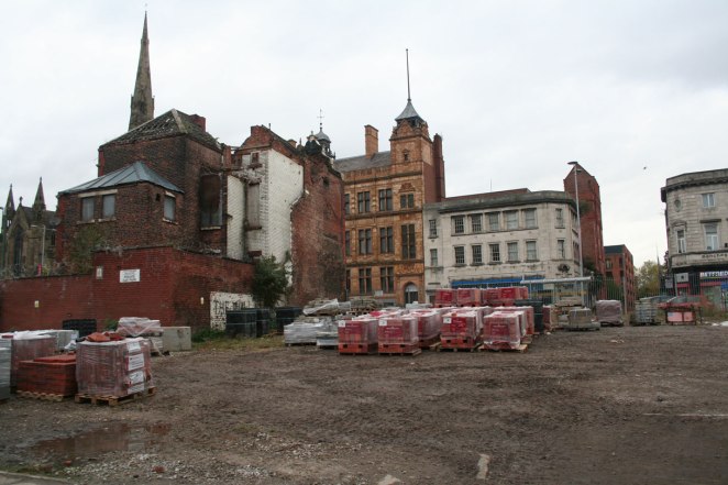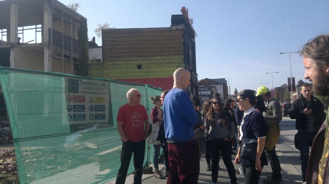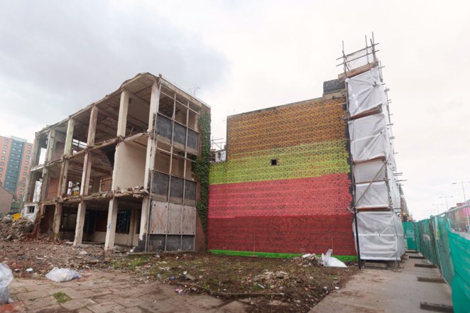 Rebuilding the east flank wall of the Old Bank Theatre / Royal Liver Friendly Society building (built 1930 at 301 Chapel Street, demolished 2014) as a grassroots monument to Salford.