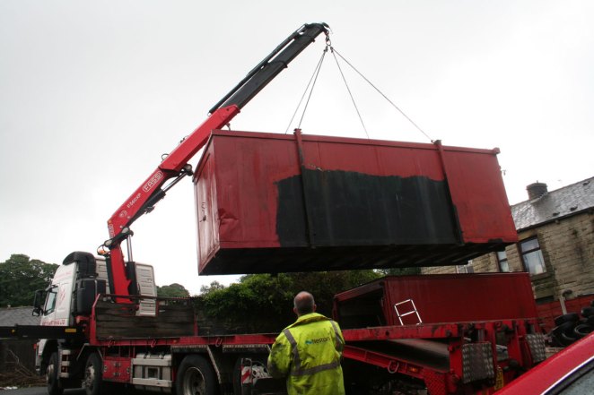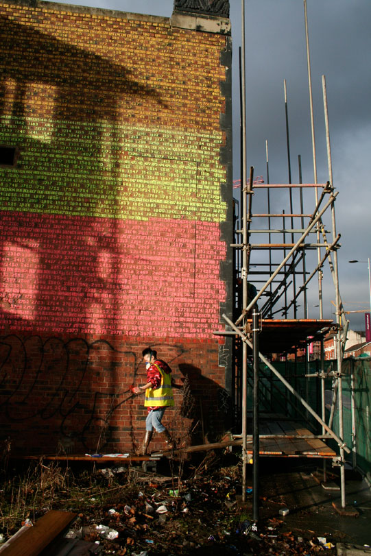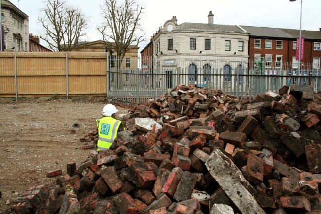 The building (built by Royal Liver Friendly Society in 1930) was bought by Salford City Council by CPO, to be demolished as part of Salford’s current regeneration. After a period of negotiation with the council, I obtained permission to work with the demolition contractors to save the east flank wall, made entirely of brick. Through the course of the demolition works, I also managed to save the stone blocks making up the building’s facade.